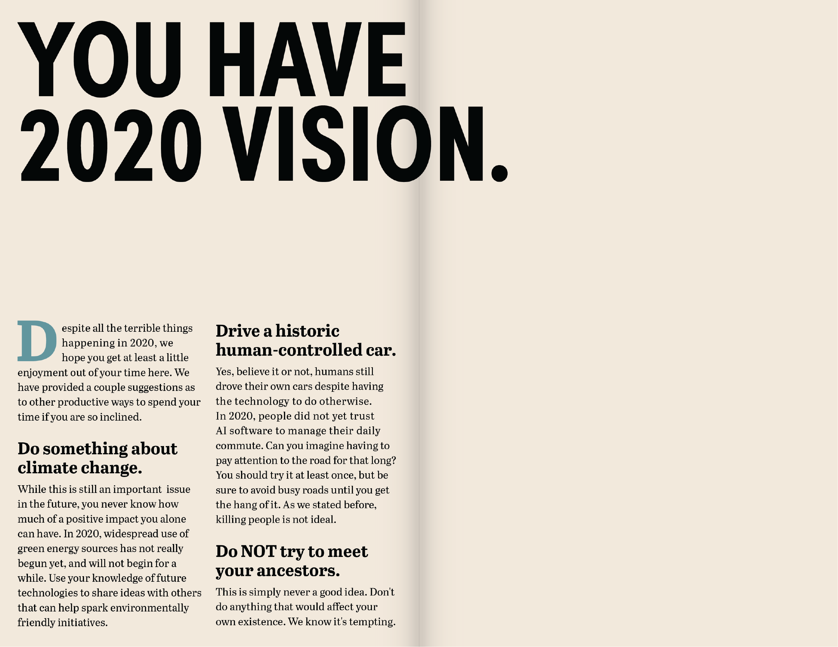 This guide is aimed at anyone who foolishly decides to time travel to the year 2020. It’s filled with tips on how to survive and what not to do.
